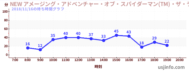 • NEW アメージング・アドベンチャー・オブ・スパイダーマン(TM)・ザ・ライド 4K3D$B$N(B2018年11月16日の待ち時間