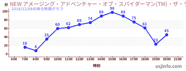 • NEW アメージング・アドベンチャー・オブ・スパイダーマン(TM)・ザ・ライド 4K3D$B$N(B2018年12月08日の待ち時間