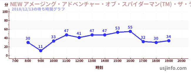 • NEW アメージング・アドベンチャー・オブ・スパイダーマン(TM)・ザ・ライド 4K3D$B$N(B2018年12月13日の待ち時間