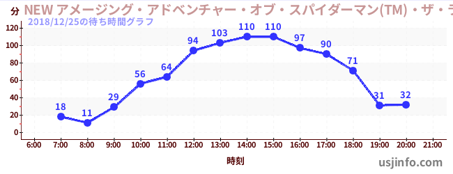 • NEW アメージング・アドベンチャー・オブ・スパイダーマン(TM)・ザ・ライド 4K3D$B$N(B2018年12月25日の待ち時間