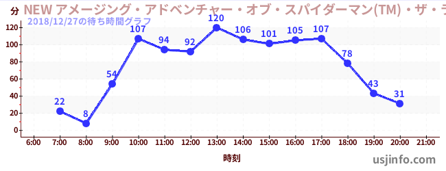• NEW アメージング・アドベンチャー・オブ・スパイダーマン(TM)・ザ・ライド 4K3D$B$N(B2018年12月27日の待ち時間