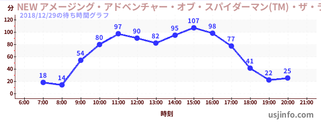 • NEW アメージング・アドベンチャー・オブ・スパイダーマン(TM)・ザ・ライド 4K3D$B$N(B2018年12月29日の待ち時間