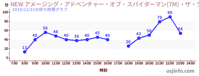 • NEW アメージング・アドベンチャー・オブ・スパイダーマン(TM)・ザ・ライド 4K3D$B$N(B2018年12月31日の待ち時間