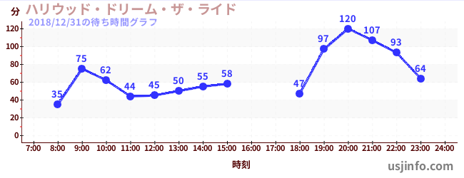• ハリウッド・ドリーム・ザ・ライド〜バックドロップ〜$B$N(B2018年12月31日の待ち時間