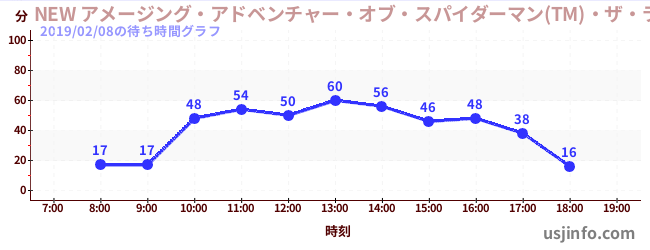 • NEW アメージング・アドベンチャー・オブ・スパイダーマン(TM)・ザ・ライド 4K3D$B$N(B2019年02月08日の待ち時間