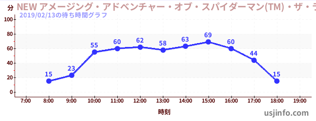 • NEW アメージング・アドベンチャー・オブ・スパイダーマン(TM)・ザ・ライド 4K3D$B$N(B2019年02月13日の待ち時間