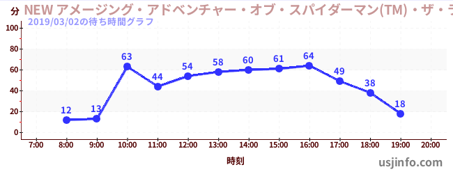 • NEW アメージング・アドベンチャー・オブ・スパイダーマン(TM)・ザ・ライド 4K3D$B$N(B2019年03月02日の待ち時間