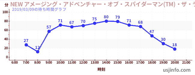 • NEW アメージング・アドベンチャー・オブ・スパイダーマン(TM)・ザ・ライド 4K3D$B$N(B2019年03月09日の待ち時間