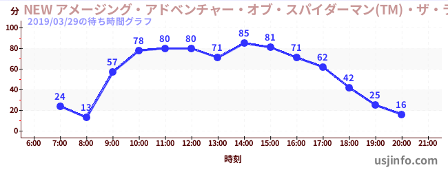 • NEW アメージング・アドベンチャー・オブ・スパイダーマン(TM)・ザ・ライド 4K3D$B$N(B2019年03月29日の待ち時間
