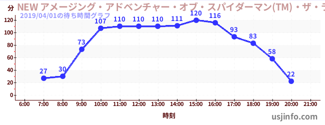 • NEW アメージング・アドベンチャー・オブ・スパイダーマン(TM)・ザ・ライド 4K3D$B$N(B2019年04月01日の待ち時間