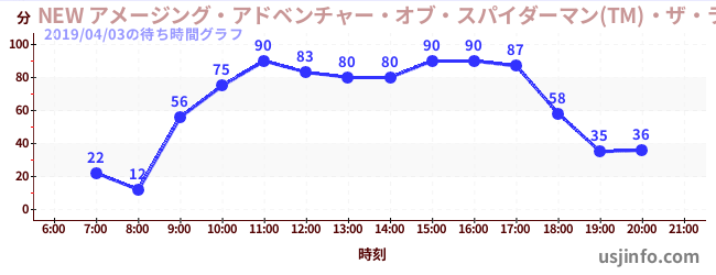 • NEW アメージング・アドベンチャー・オブ・スパイダーマン(TM)・ザ・ライド 4K3D$B$N(B2019年04月03日の待ち時間