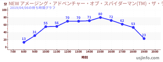 • NEW アメージング・アドベンチャー・オブ・スパイダーマン(TM)・ザ・ライド 4K3D$B$N(B2019年04月06日の待ち時間