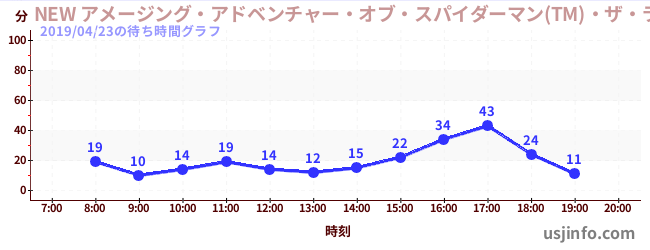 • NEW アメージング・アドベンチャー・オブ・スパイダーマン(TM)・ザ・ライド 4K3D$B$N(B2019年04月23日の待ち時間