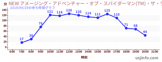 • NEW アメージング・アドベンチャー・オブ・スパイダーマン(TM)・ザ・ライド 4K3D$B$N(B2019年04月29日の待ち時間