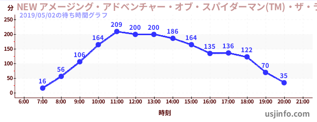 • NEW アメージング・アドベンチャー・オブ・スパイダーマン(TM)・ザ・ライド 4K3D$B$N(B2019年05月02日の待ち時間