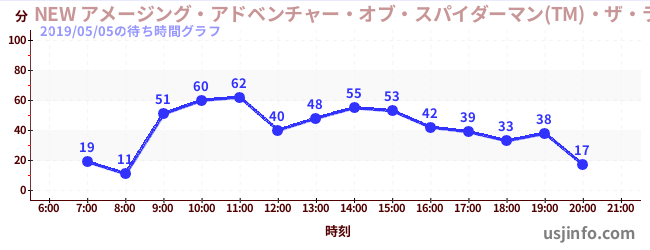 • NEW アメージング・アドベンチャー・オブ・スパイダーマン(TM)・ザ・ライド 4K3D$B$N(B2019年05月05日の待ち時間