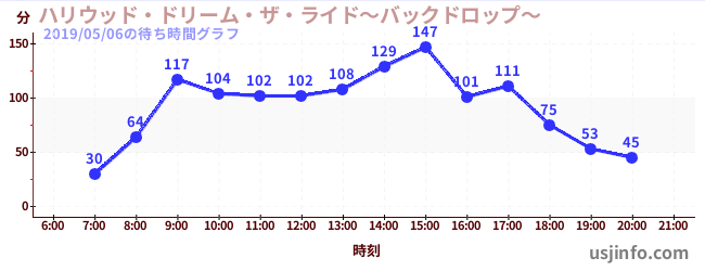 • ハリウッド・ドリーム・ザ・ライド〜バックドロップ〜$B$N(B2019年05月06日の待ち時間