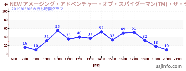 • NEW アメージング・アドベンチャー・オブ・スパイダーマン(TM)・ザ・ライド 4K3D$B$N(B2019年05月06日の待ち時間