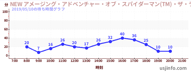 • NEW アメージング・アドベンチャー・オブ・スパイダーマン(TM)・ザ・ライド 4K3D$B$N(B2019年05月10日の待ち時間