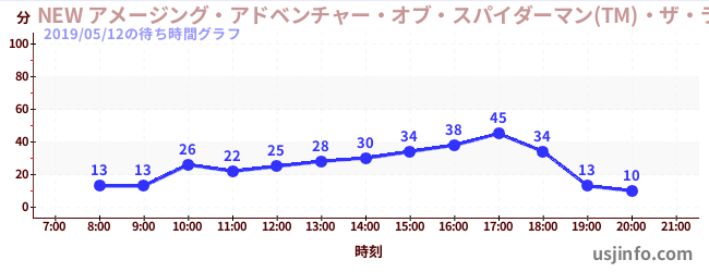 • NEW アメージング・アドベンチャー・オブ・スパイダーマン(TM)・ザ・ライド 4K3D$B$N(B2019年05月12日の待ち時間