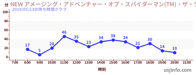 • NEW アメージング・アドベンチャー・オブ・スパイダーマン(TM)・ザ・ライド 4K3D$B$N(B2019年05月13日の待ち時間