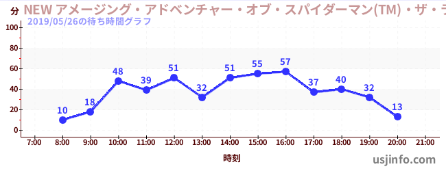 • NEW アメージング・アドベンチャー・オブ・スパイダーマン(TM)・ザ・ライド 4K3D$B$N(B2019年05月26日の待ち時間