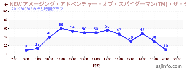 • NEW アメージング・アドベンチャー・オブ・スパイダーマン(TM)・ザ・ライド 4K3D$B$N(B2019年06月03日の待ち時間