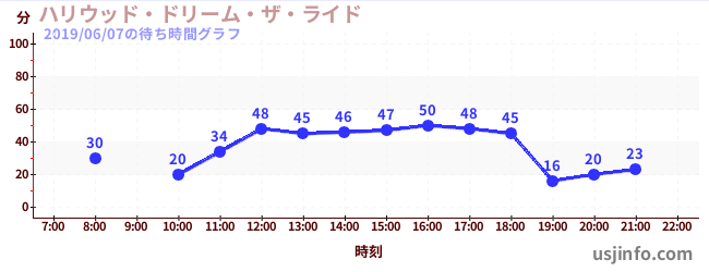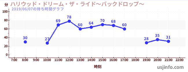 • ハリウッド・ドリーム・ザ・ライド〜バックドロップ〜$B$N(B2019年06月07日の待ち時間
