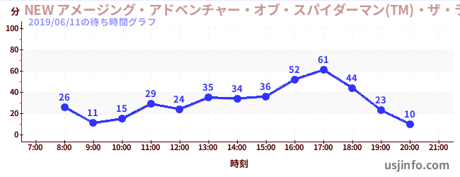 • NEW アメージング・アドベンチャー・オブ・スパイダーマン(TM)・ザ・ライド 4K3D$B$N(B2019年06月11日の待ち時間