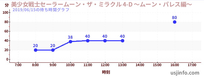• 美少女戦士セーラームーン・ザ・ミラクル 4-D ~ムーン・パレス編~$B$N(B2019年06月15日の待ち時間