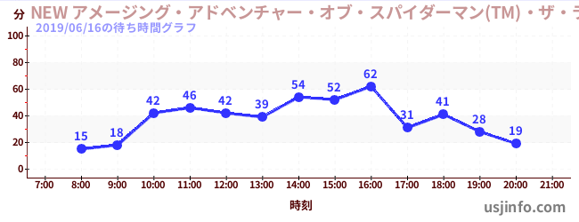 • NEW アメージング・アドベンチャー・オブ・スパイダーマン(TM)・ザ・ライド 4K3D$B$N(B2019年06月16日の待ち時間