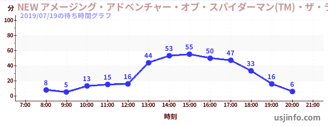 • NEW アメージング・アドベンチャー・オブ・スパイダーマン(TM)・ザ・ライド 4K3D$B$N(B2019年07月19日の待ち時間