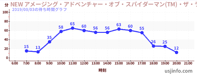 • NEW アメージング・アドベンチャー・オブ・スパイダーマン(TM)・ザ・ライド 4K3D$B$N(B2019年08月03日の待ち時間