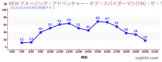 • NEW アメージング・アドベンチャー・オブ・スパイダーマン(TM)・ザ・ライド 4K3D$B$N(B2019年08月04日の待ち時間