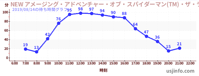 • NEW アメージング・アドベンチャー・オブ・スパイダーマン(TM)・ザ・ライド 4K3D$B$N(B2019年08月14日の待ち時間