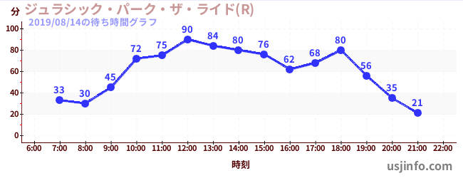 • ジュラシック・パーク・ザ・ライド(R)$B$N(B2019年08月14日の待ち時間