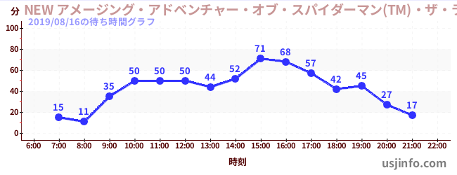 • NEW アメージング・アドベンチャー・オブ・スパイダーマン(TM)・ザ・ライド 4K3D$B$N(B2019年08月16日の待ち時間