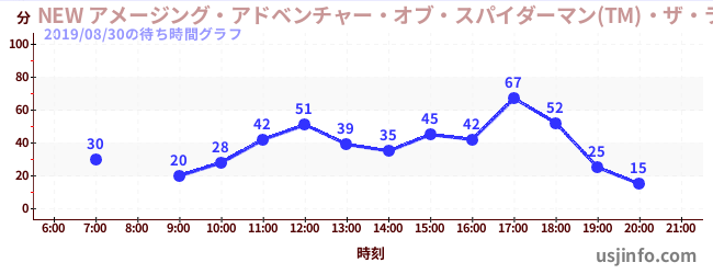 • NEW アメージング・アドベンチャー・オブ・スパイダーマン(TM)・ザ・ライド 4K3D$B$N(B2019年08月30日の待ち時間