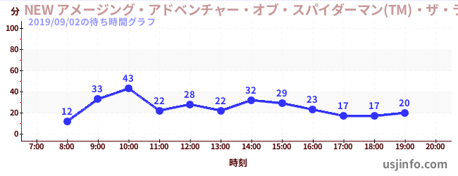 • NEW アメージング・アドベンチャー・オブ・スパイダーマン(TM)・ザ・ライド 4K3D$B$N(B2019年09月02日の待ち時間