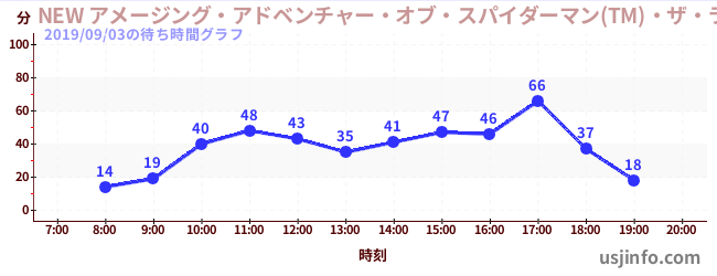 • NEW アメージング・アドベンチャー・オブ・スパイダーマン(TM)・ザ・ライド 4K3D$B$N(B2019年09月03日の待ち時間