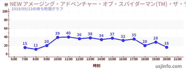 • NEW アメージング・アドベンチャー・オブ・スパイダーマン(TM)・ザ・ライド 4K3D$B$N(B2019年09月13日の待ち時間