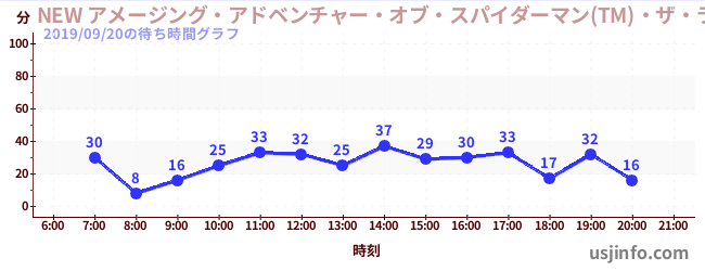 • NEW アメージング・アドベンチャー・オブ・スパイダーマン(TM)・ザ・ライド 4K3D$B$N(B2019年09月20日の待ち時間