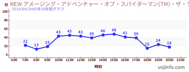 • NEW アメージング・アドベンチャー・オブ・スパイダーマン(TM)・ザ・ライド 4K3D$B$N(B2019年09月24日の待ち時間