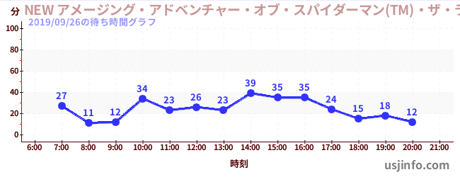 • NEW アメージング・アドベンチャー・オブ・スパイダーマン(TM)・ザ・ライド 4K3D$B$N(B2019年09月26日の待ち時間