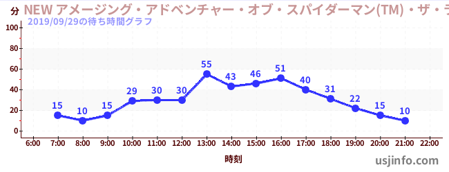 • NEW アメージング・アドベンチャー・オブ・スパイダーマン(TM)・ザ・ライド 4K3D$B$N(B2019年09月29日の待ち時間