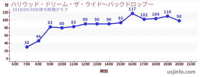 • ハリウッド・ドリーム・ザ・ライド〜バックドロップ〜$B$N(B2019年09月30日の待ち時間