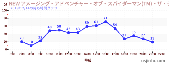 • NEW アメージング・アドベンチャー・オブ・スパイダーマン(TM)・ザ・ライド 4K3D$B$N(B2019年12月14日の待ち時間