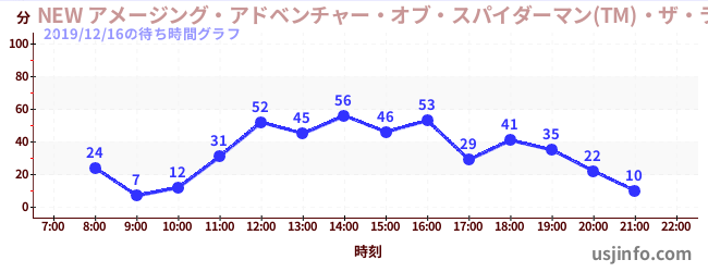 • NEW アメージング・アドベンチャー・オブ・スパイダーマン(TM)・ザ・ライド 4K3D$B$N(B2019年12月16日の待ち時間