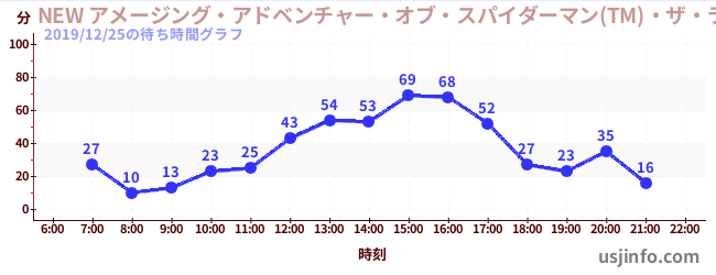 • NEW アメージング・アドベンチャー・オブ・スパイダーマン(TM)・ザ・ライド 4K3D$B$N(B2019年12月25日の待ち時間