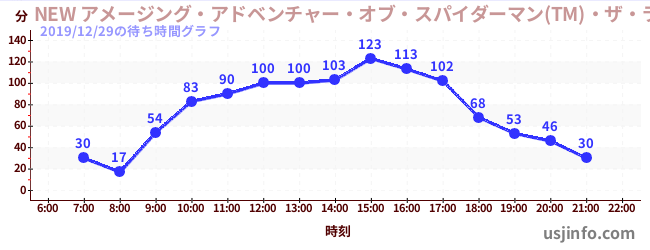 • NEW アメージング・アドベンチャー・オブ・スパイダーマン(TM)・ザ・ライド 4K3D$B$N(B2019年12月29日の待ち時間